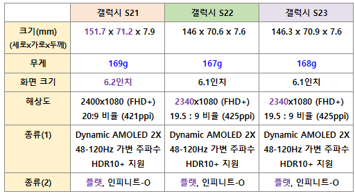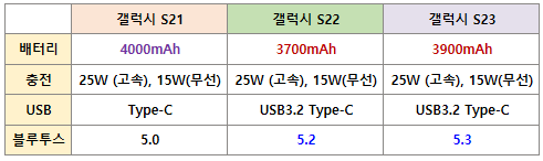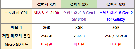 갤럭시 S21, S22, S23 스펙 차이 비교표 (일반/기본 모델)
