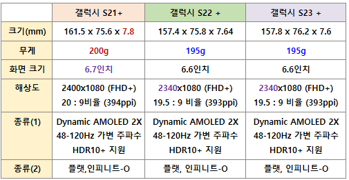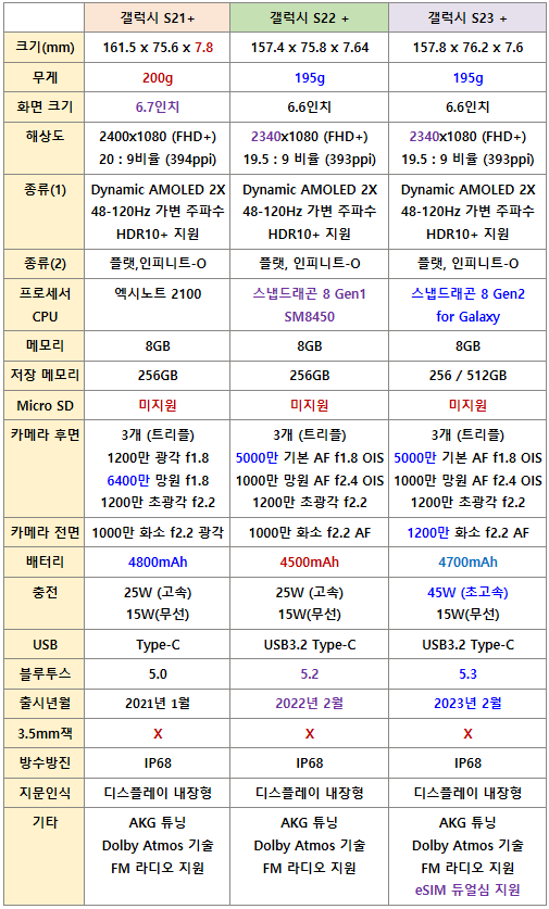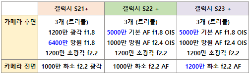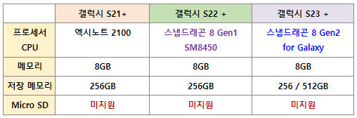 갤럭시 S21+, S22+, S23+ 스펙 차이 비교표